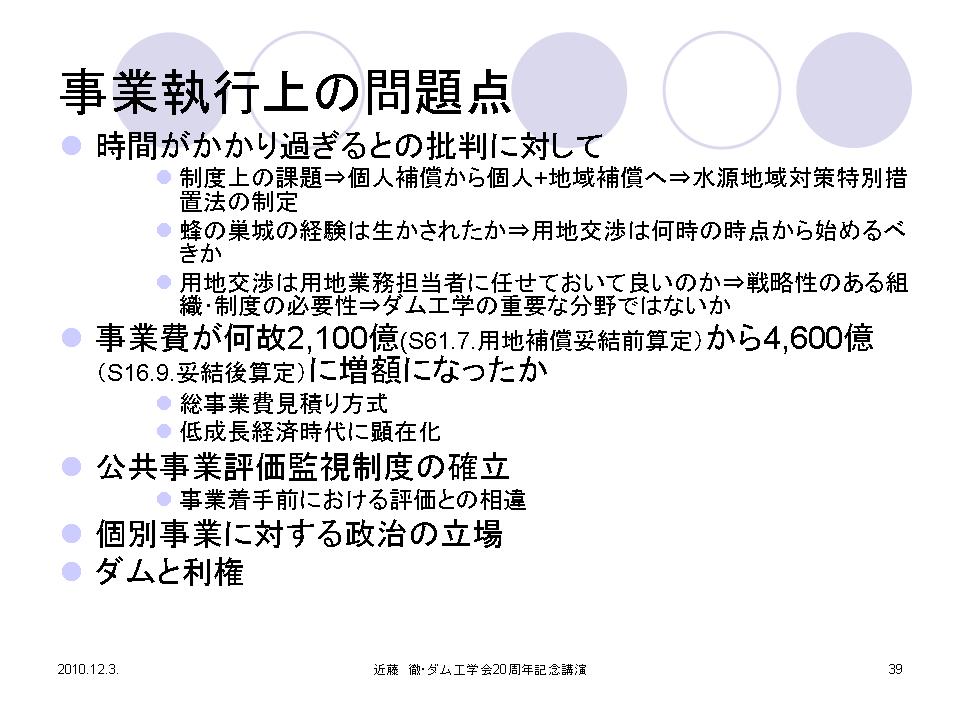 図-39は、事業執行上の問題点です。公共事業評価監視制度の確立とあるのは、先ほど少しふれました事業の途中での評価というので青山さんが始めたものです。それから地域の個人だけを補償するだけでなく、地域補償までするべきではないか、という意見に対しては、八ツ場ダムが契機になって、水源地域対策特別措置法というのができました。