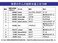 図-2に示されているのが世界のダム、これは2003年のデータですけれども、ダムの総貯水量の上位10件を示したものです。御覧のように、ジンバブエ、ロシア、エジプト、ガーナ、カナダ、ベネズエラ、中国等々いろいろ挙がっておりますけれども、ここで見ておわかりいただけると思いますが、ダム1つの総貯水量は最大1,800億m3ぐらいでございます。