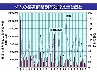 図-10は各都道府県の有効貯水容量とダム数を示したものです。この図では都道府県ごとにダムの数、この折れ線がダム数、それから棒グラフで書いたのが有効貯水量なのですが、都道府県別に見ると、一番左が北海道で、一番右が沖縄です。見るとわかりますようにダムの数が非常に多いところと、数はそんなにないけれども、貯水量が多いところと、いろいろあります。