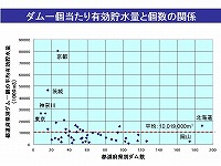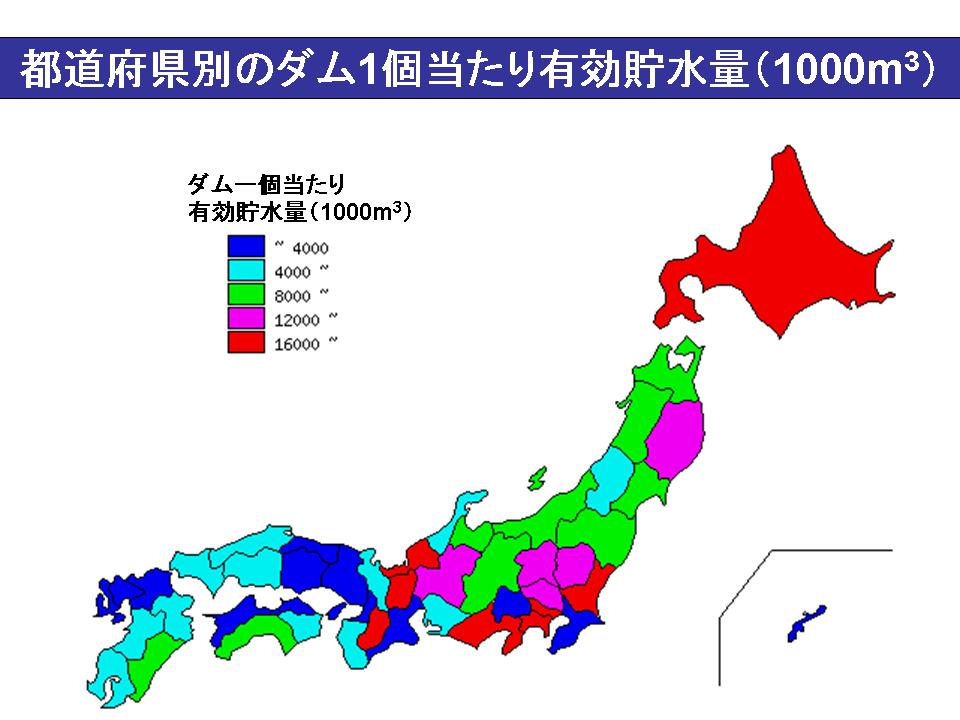 都道府県別のダム1個当たりの有効貯水量を示したのが図-14です。これを見ると、関西から西ですね、こちらのほうは、非常に小さいことがわかります。逆に、こちらの東京周辺、それから東北周辺は結構大きい。全国の渇水状況等の比較をすると、やはりいつも水が足らないと言われているようなところが、実は非常にダムの貯水量も少ないということになっております。