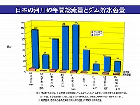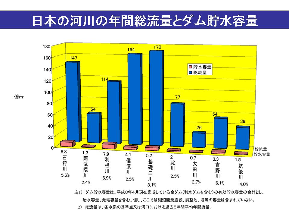 我が国と諸外国の河川の違いを見るとわかりますけれども、我が国の川は、非常に河口から短い。日本は狭いので、河川がゆったりと流れるというようなものではございません。ですから、一気に海に流れてしまう。それと、山が多いですから、川幅も当然狭いし、結果的にダムがあっても、貯水容量は極めて小さいということになります。