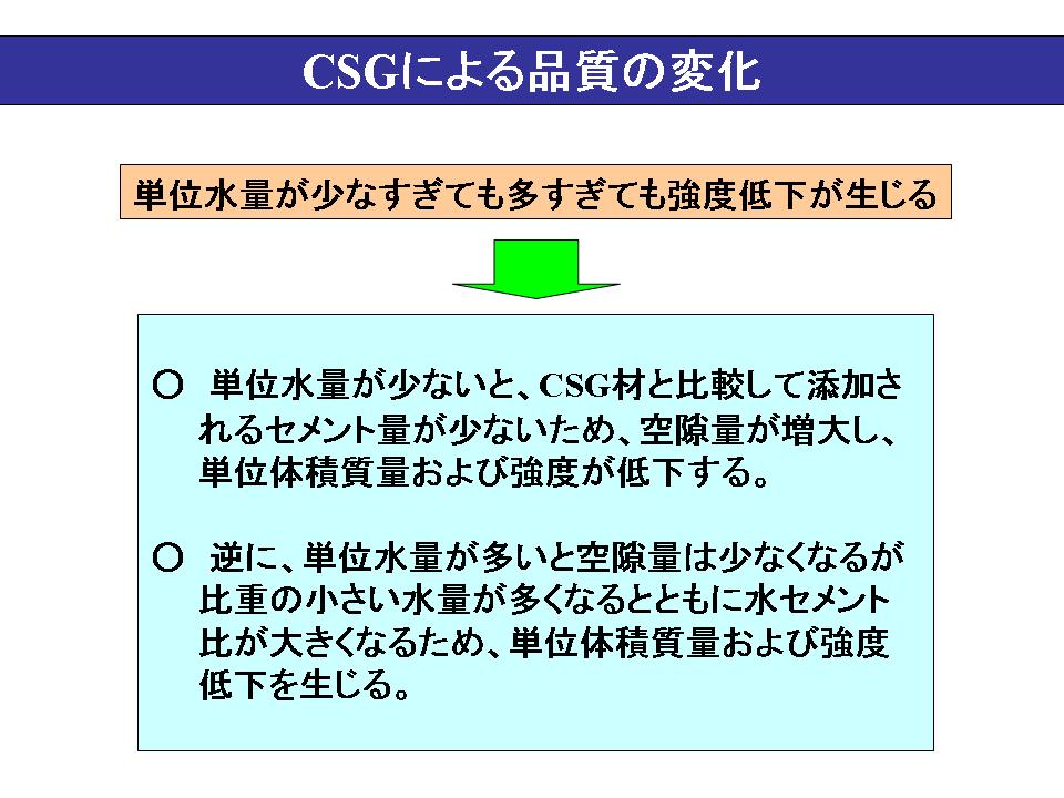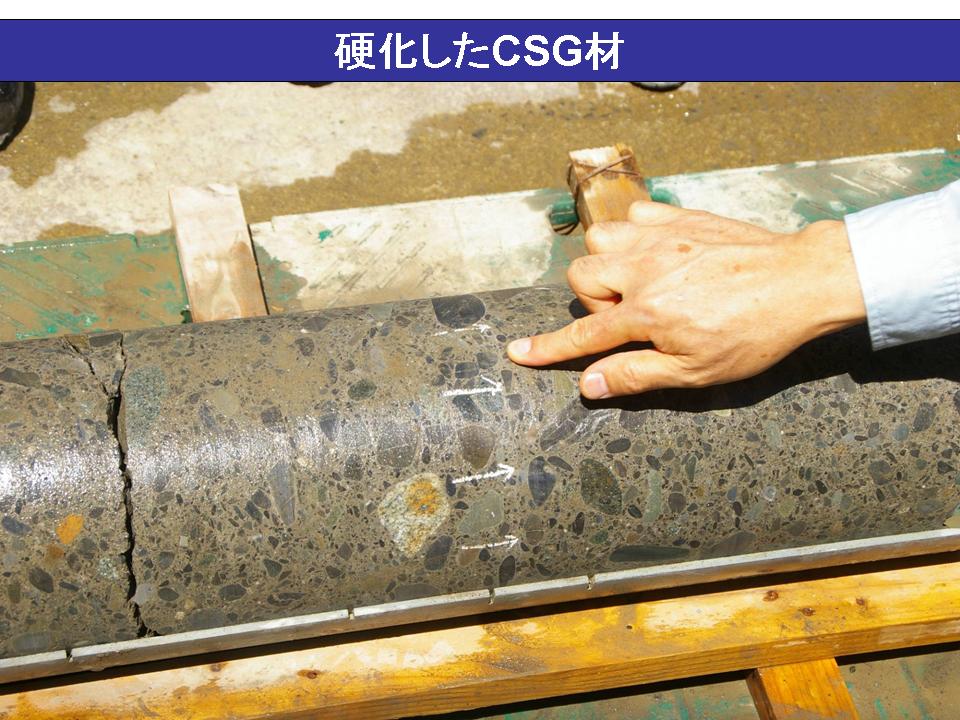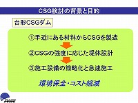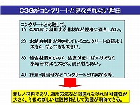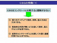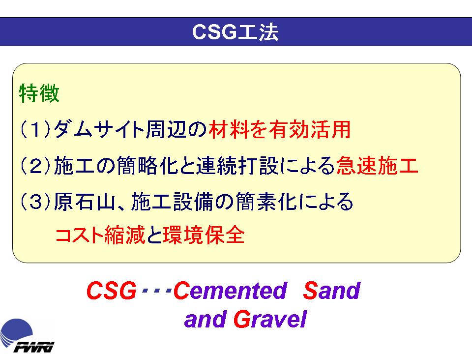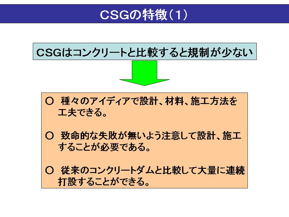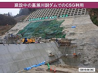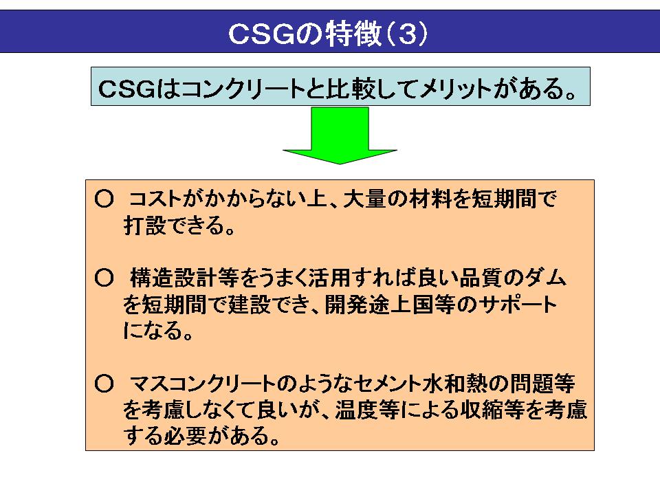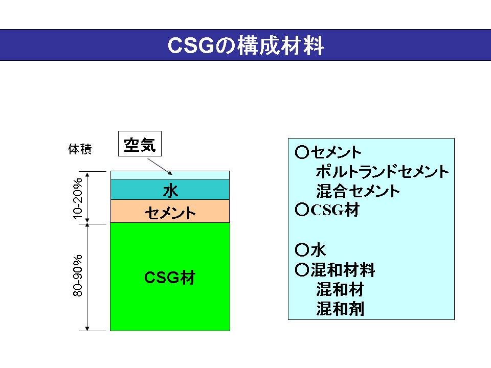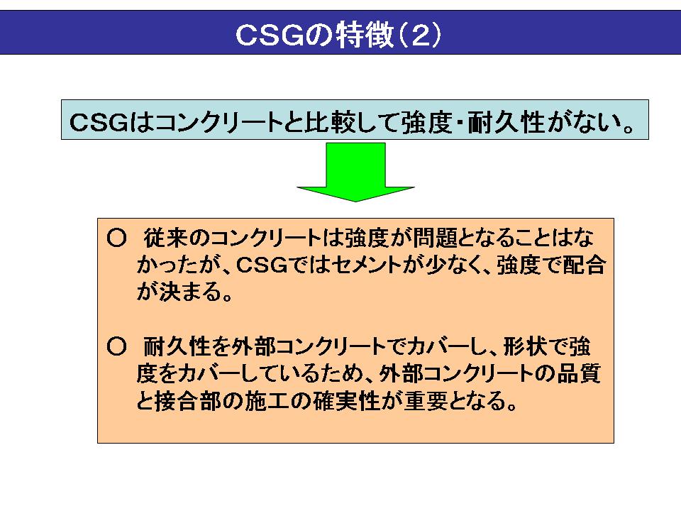 CSG工法というのは、セメントで砂と砂利を一緒にしたものというような言い方をしています。CSGは、「Cemented Sand and Gravel」という略なのですけれども、現地で簡単にとれる材料を有効に使いましょう、それから骨材を今までのように、通常のコンクリートに使う骨材のような厳密なものではなくてもっと低品質なものも利用してしまおう、それと急速施工してしまおうということを狙ったものです。