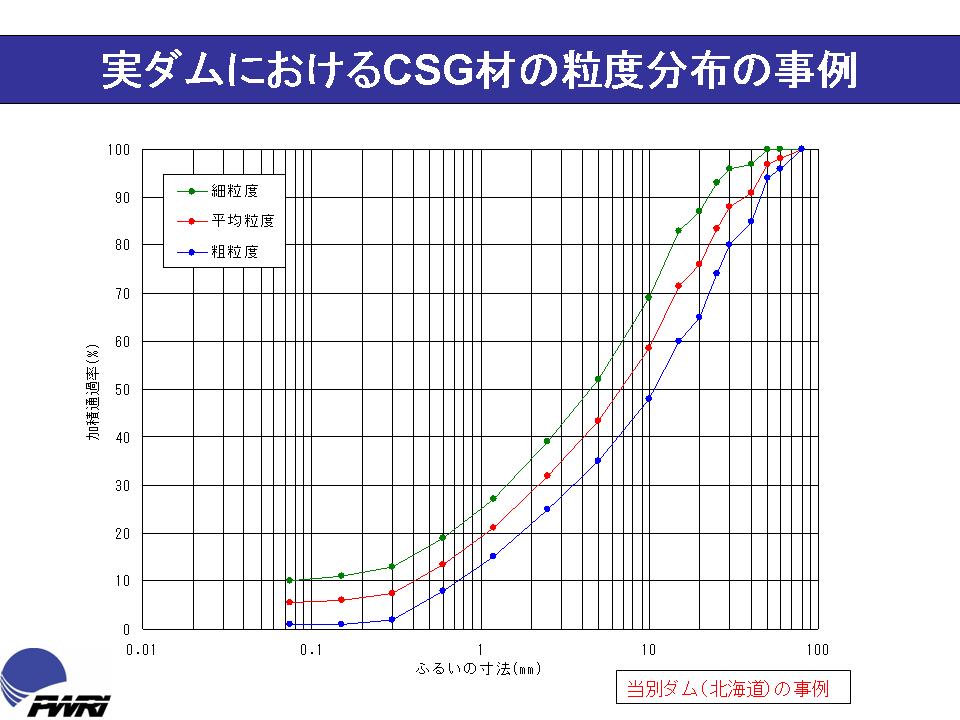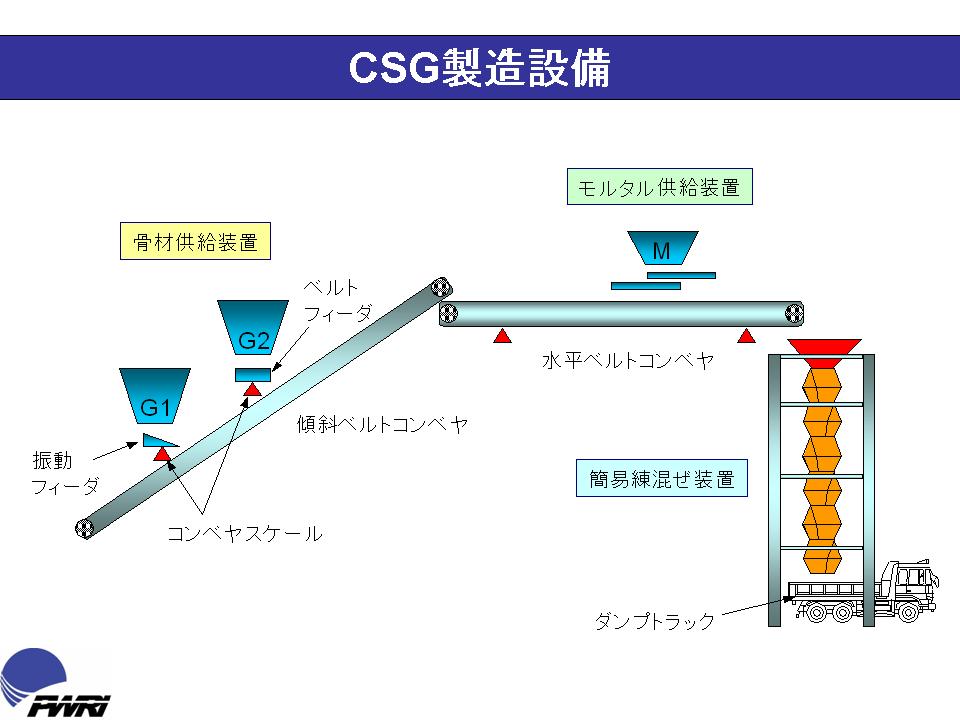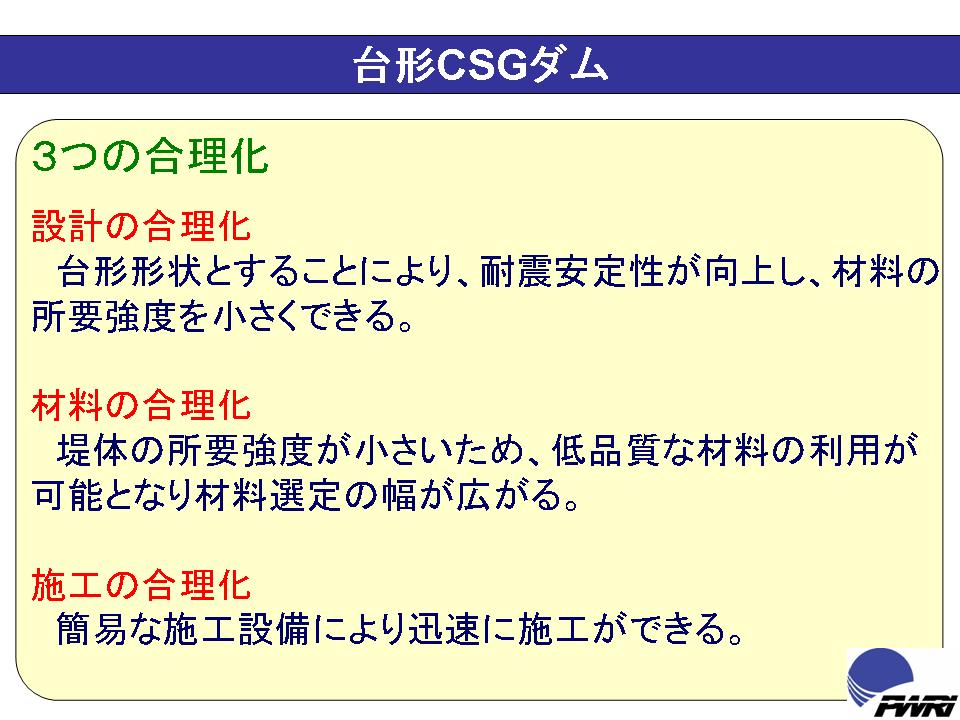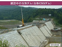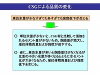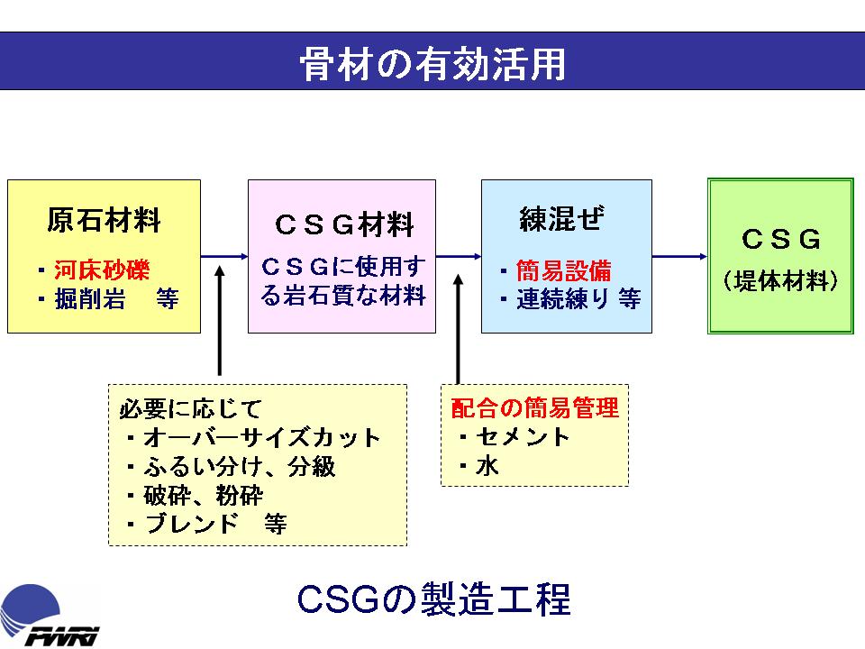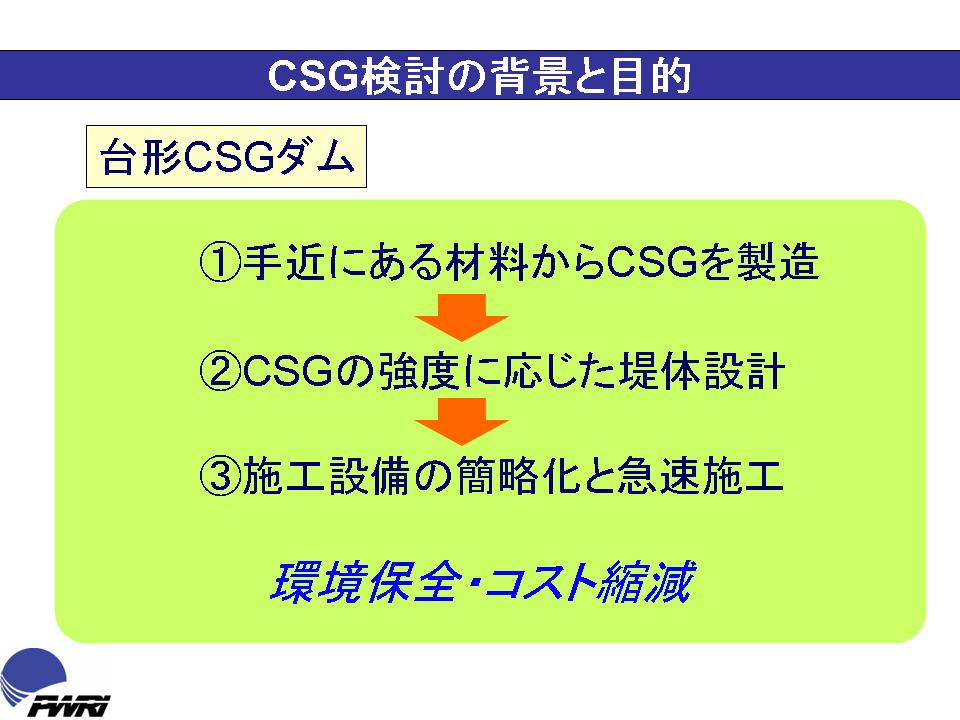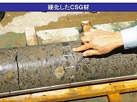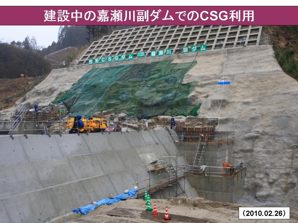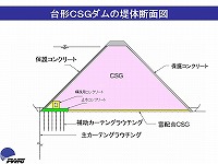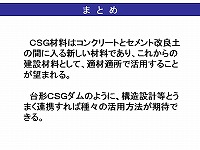 CSG工法というのは、セメントで砂と砂利を一緒にしたものというような言い方をしています。CSGは、「Cemented Sand and Gravel」という略なのですけれども、現地で簡単にとれる材料を有効に使いましょう、それから骨材を今までのように、通常のコンクリートに使う骨材のような厳密なものではなくてもっと低品質なものも利用してしまおう、それと急速施工してしまおうということを狙ったものです。