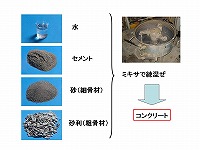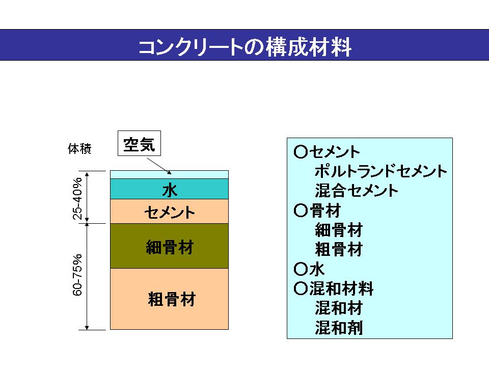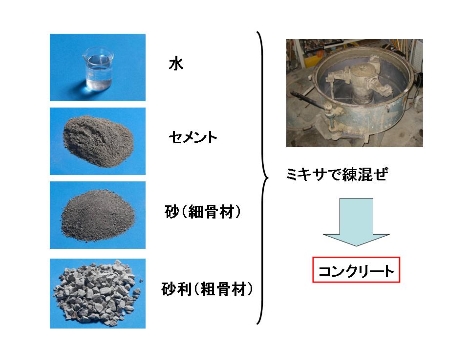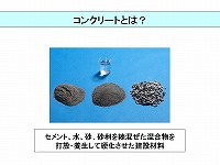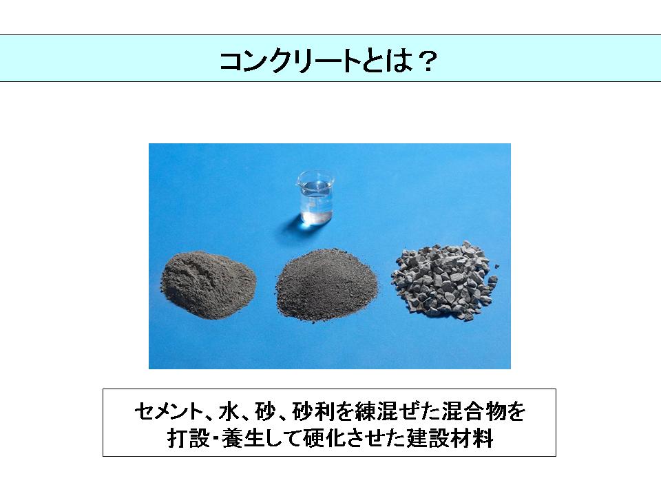 コンクリートは何でできているか。セメントと水と砂と砂利、これを混ぜて締め固めて、打設して、養生して、固まらせた材料ですということになります。(図-26参照)