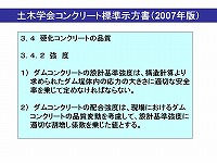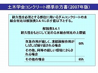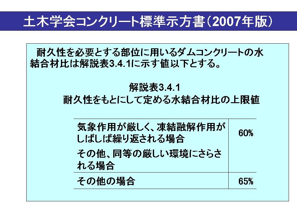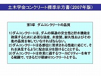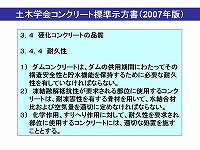 固まったコンクリートの耐久性は、少なくともダムを利用している間、例えば100年なら100年、その間、構造安全性と貯水機能が保持できることが大事です。凍結融解、それから化学抵抗性等々、こういう耐久性もなければならないということになっています。(図-34参照)
