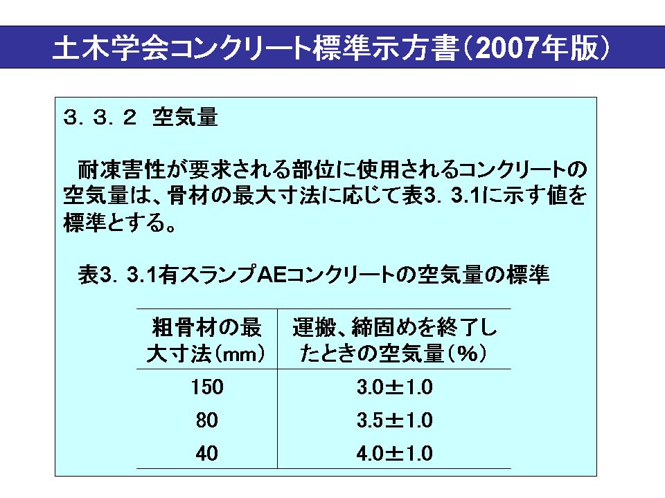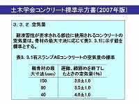 例えば、固まらないコンクリートでは、コンシステンシーについては、有スランプコンクリートの場合には40mmふるいでウエットスクリーニングした資料で2cm〜5cmぐらい、それから、スランプゼロのRCDコンクリートではVC値を20秒程度というような数値の中に入らないといけないということになっています。(図-31参照)それから、空気量もコンクリートの中にはこれだけ入っていなきゃだめだと、特に耐凍害性が要求される部位にはこれぐらいないとだめだということになっています。(図-32参照)