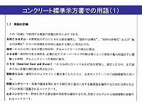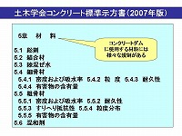コンクリートの材料、これはいろいろな規制があります。図-36にあがっているように、例えば骨材だけでも、密度、吸水率、粒度、耐久性、有害物の含有量、細骨材も同じです。さらに、すりへり抵抗性だとか、こういうものも全部条件に入っています。