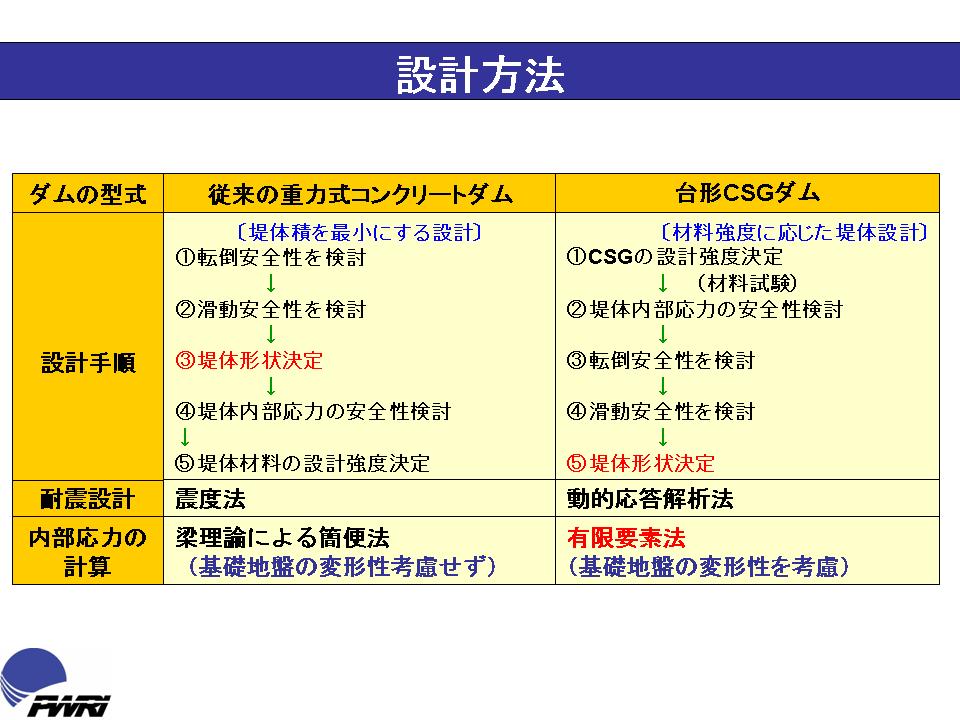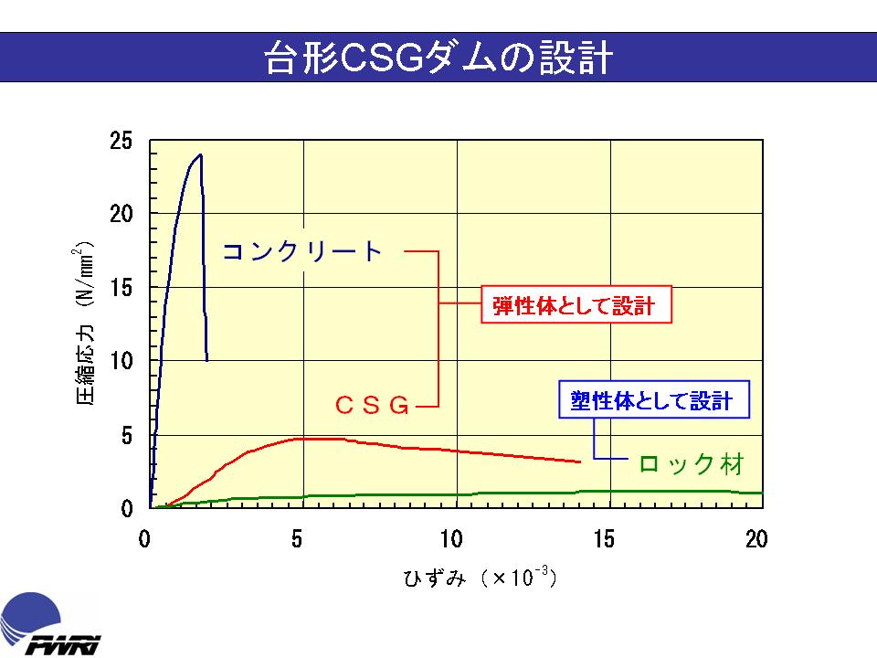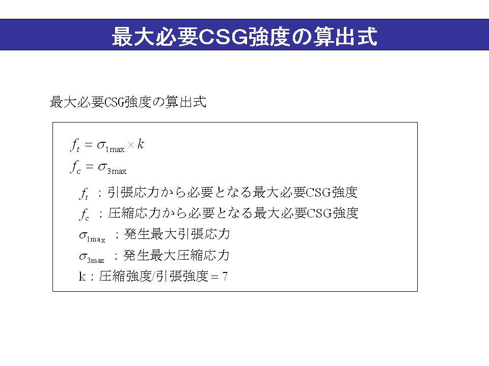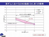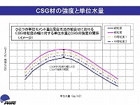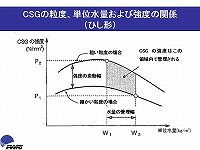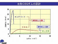 ご存じとは思いますけれども、今までアーチダムを除けば、重力式ダムでコンクリートの強度が問題になったことはありません。最近、耐震の問題で部分的に大丈夫かとかいう話になりますけれども、ほとんどのものが、条件が耐久性のほうが厳しいものですから、耐久性をクリアすれば、結果的に強度はみんなクリアするという形になっています。それが、今度実はCSGになると、ぎりぎりなところをやることになります。そこら辺が、今後ある程度、さらにいろいろ検討しながらやらなければいけない問題だろうというふうに言えます。(図-40、41参照)