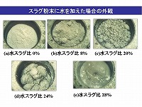何が言いたいかというと、単位体積重量が小さいこの部分というのは空隙が物すごく多い。単位水量が大きくなるとようやく理論的な、いわゆる粉と水の体積でちゃんと計算したものと一致します。その状態は何かというと図-49です。水が入っていないとき、左上の写真ですが、これは非常に緻密に見えますけれども、約半分が空隙です。それに若干ずつ水を加えていくと、「だま」ができます。この「だま」ができるということはどういうことかというと、その「だま」の部分はちゃんと密実になります。しかし、「だま」と「だま」の間は密実にはなりません。