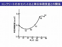 実は、これはコンクリートも同じです。コンクリートの水セメント比と単位体積重量の関係は、最初、水が少ないと図-50に示すように単位体積重量は小さくなっていき、さらに水が増大すると単位体積重量が大きくなっていきます。