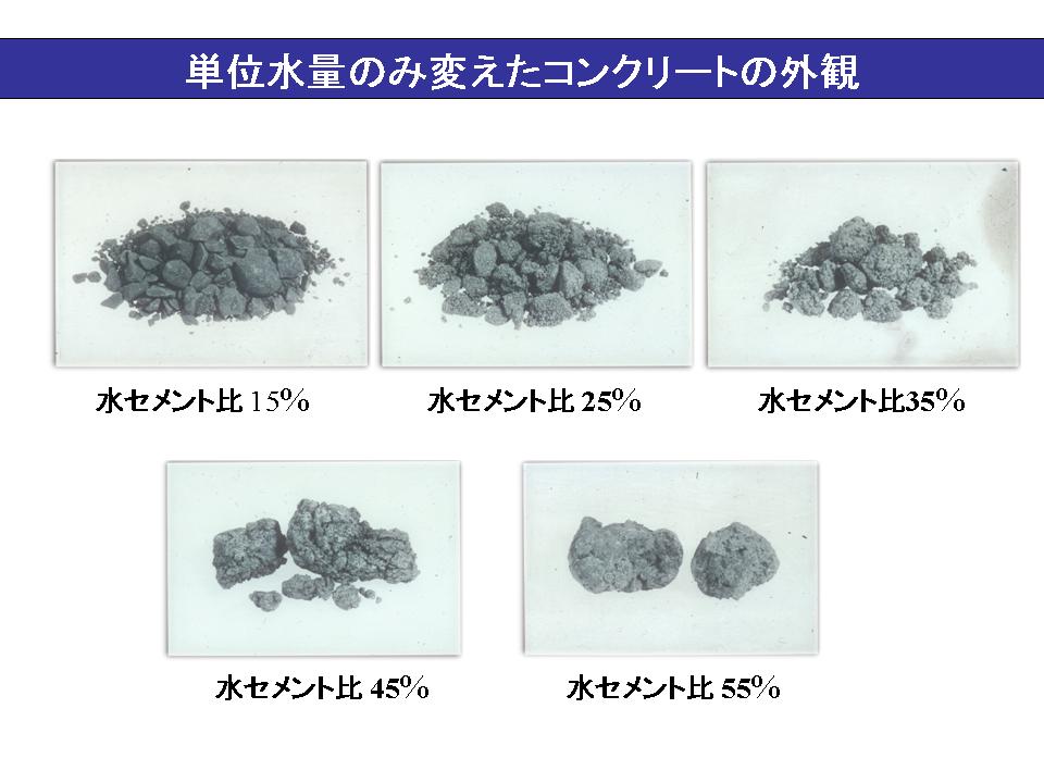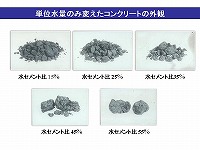 図-51は、単位水量を変えたコンクリートの外観です。この写真ではよくわからないんですが、水セメント比が小さいと、同じ体積の中に詰めても空隙が非常に多くなります。だから、結果的に強度が出ない。ところが、水セメント比がある値を超えると強度が出るようになります。すなわち、理論値と合うようになります。水セメント比55%の方ですね。