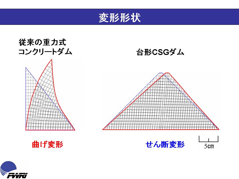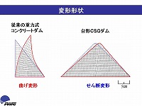 また、変形も、従来の重力式コンクリートダムですと、図-60に示すように曲げ変形が主となりますが、台形CSGダムですと、これがただ横にずれるような剪断変形のほうが大きくなります。