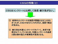 ある意味では、CSG材料の規制は今の段階ではまだありません。しかし、これからたくさんの例ができてしまうとまた違うものになるかもしれません。今の段階だといろいろなことが試せる、ある意味では技術者としては一番おもしろい材料であります。