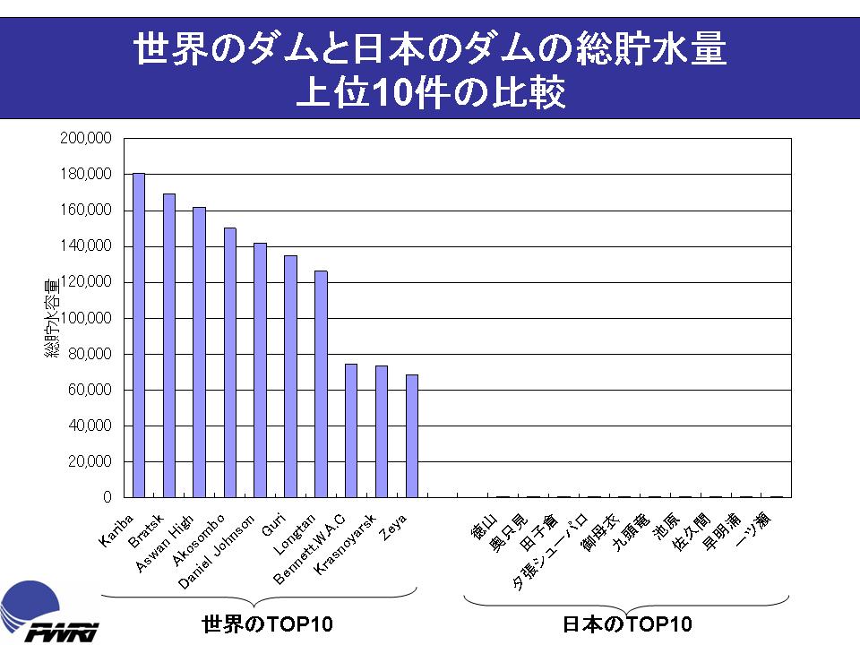 ということはどういうことかということで、わざと図-4をつくっておいたのですけれども、世界のトップのほうのダムを日本のダム、一応、グラフの上ではこうやって点みたいになっていますけれども、と比較するとこれぐらいの差がございます。規模が全然違うということはご覧のとおりです。