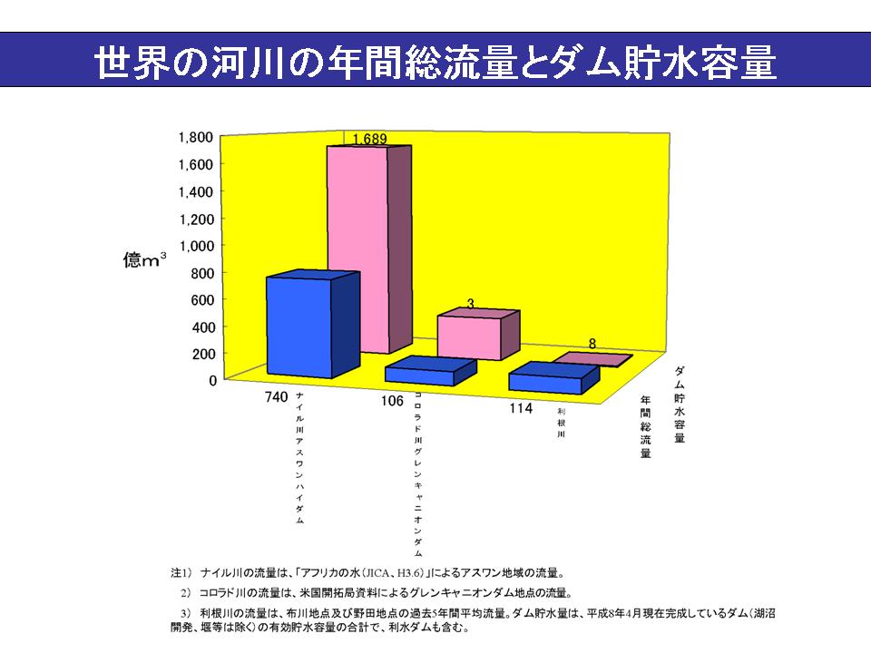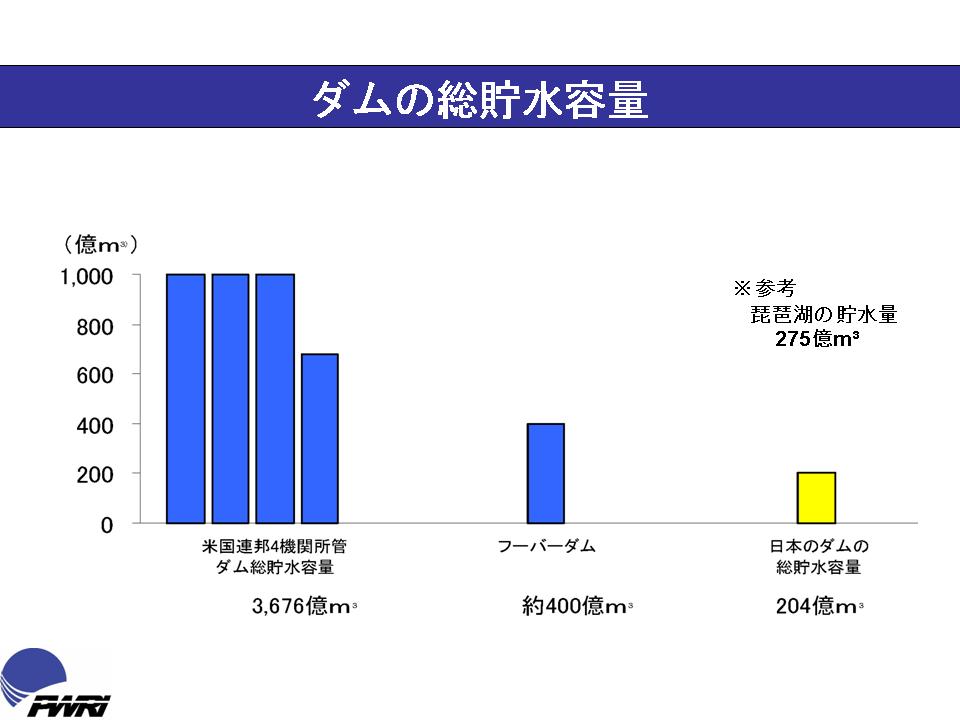 ですから、図-5に示しますように、例えばダムの総貯水量として、日本のダムの総貯水量は204億m3なのですけれども、アメリカにあるフーバーダム1個、これが400億m3です。だから、日本のダムの貯水量を全部合わせてもフーバーダムの半分ぐらいにしかなりません。琵琶湖の貯水量が275億m3ですから、両方合わせても500億m3ぐらいですから、例えばアメリカでの総貯水量の7分の1、その程度のものなのです。