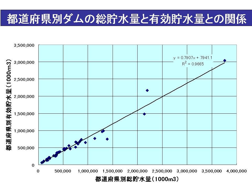 図-8に都道府県別に、総貯水量と有効貯水量の関係を示していますが、有効貯水容量は総貯水容量の大体0.8掛けぐらいの、「y=0.7907x」となっています。