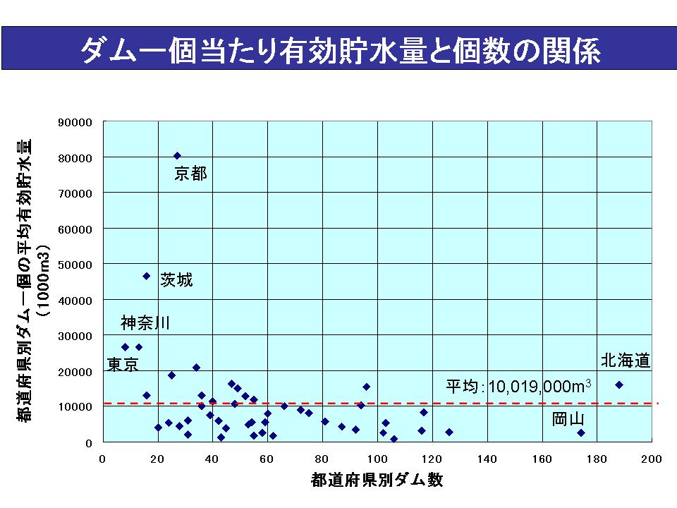 有効貯水量の全体の平均が、先ほど言いました1,000万m3ぐらいですが(図-11参照)、例えば、京都、茨城、神奈川、東京等は、ダムの数が少ない割には、結構それなりの貯水量があります。これはどういうことかというと、ダム1個当たりの平均有効貯水量が大きいからです。また逆に、岡山等は、それが小さいということがわかります。