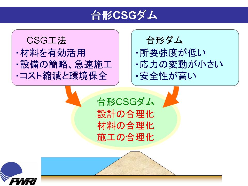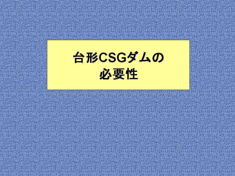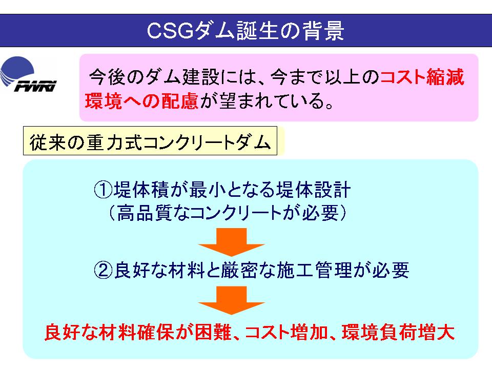実は、台形CSGダムというのが今現在いろいろなところで建設されておりますけれども、どうしてそんなものができたかというと、今まで以上のコスト縮減と環境への配慮ということが望まれてできてきたものであります。