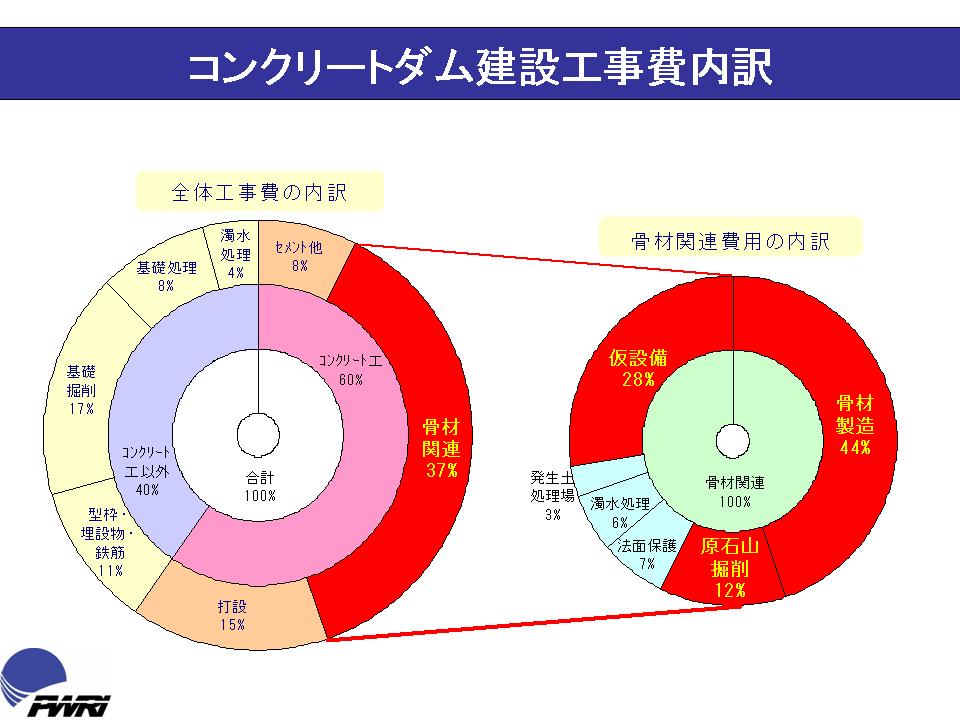 コンクリート工の中の実は大半が骨材に関係するものです。コンクリートは、セメント、骨材で大体できるわけですけれども、打設にかかる費用はそれほど大きな割合を占めているわけではありません。この骨材関連の割合が非常に多いのです。なぜそうなるかというと、骨材を現場に遠くから運んでいくというのではどうしても金がかかってしようがないので、現地近くで当然骨材を製造するということになります。それから、原石山の掘削等々が入ります。こういうものが骨材製造の中に入っているので、骨材関係の費用がかなり大きなウエートを占めています。