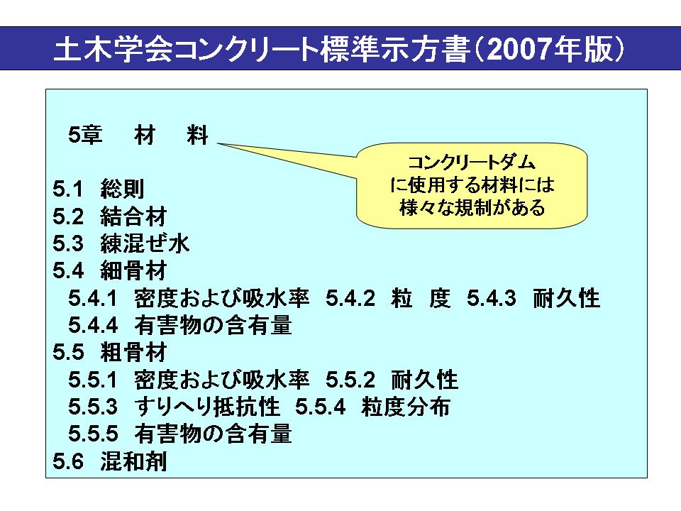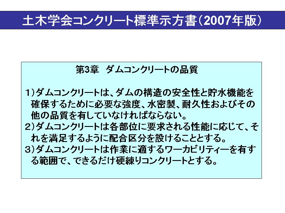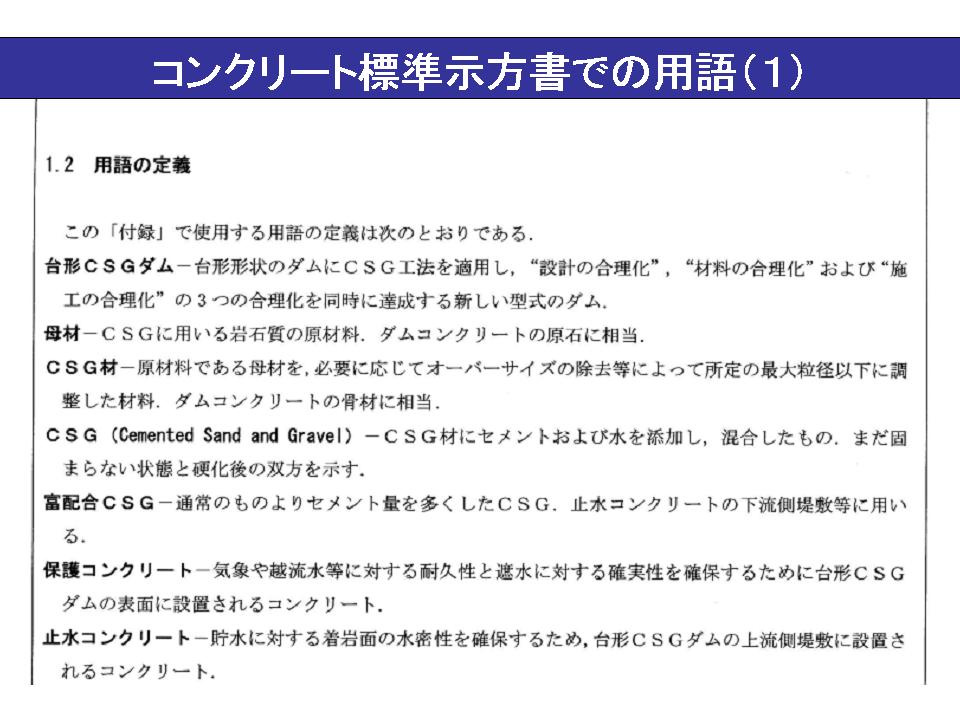 実は、私、土木学会のコンクリート委員会の委員長をさせていただいておりまして、2007年に、もう古いものになりましたけれども、コンクリートの標準示方書というのを出させていただいています。このコンクリート標準示方書には、「ダムコンクリート編」というのがあるのですが、実はこの中に「付録」として、台形CSGダムの話が書いてあります。