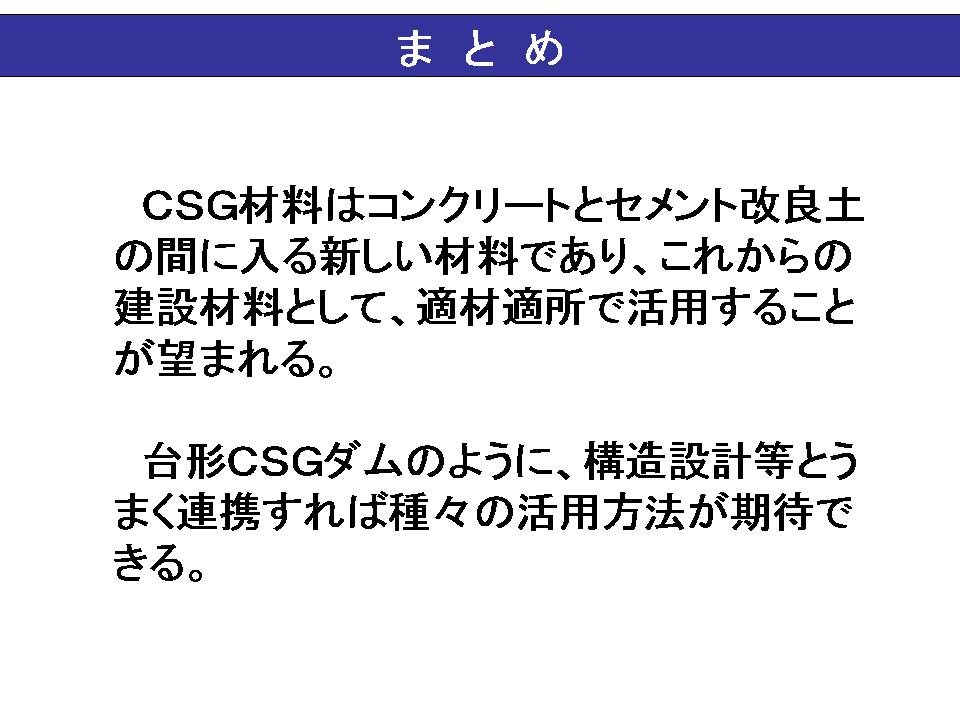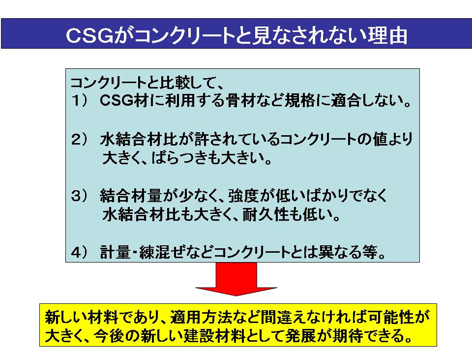 当然、問題点もまだいろいろありますけれども、CSGはかなりこれからの有望な建設材料として使えるのではないかと思われます。