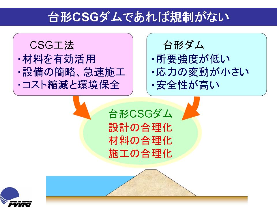 こういうような状況を一応踏まえまして、今、台形CSGダムという新しい型式のダムが非常に注目されております。