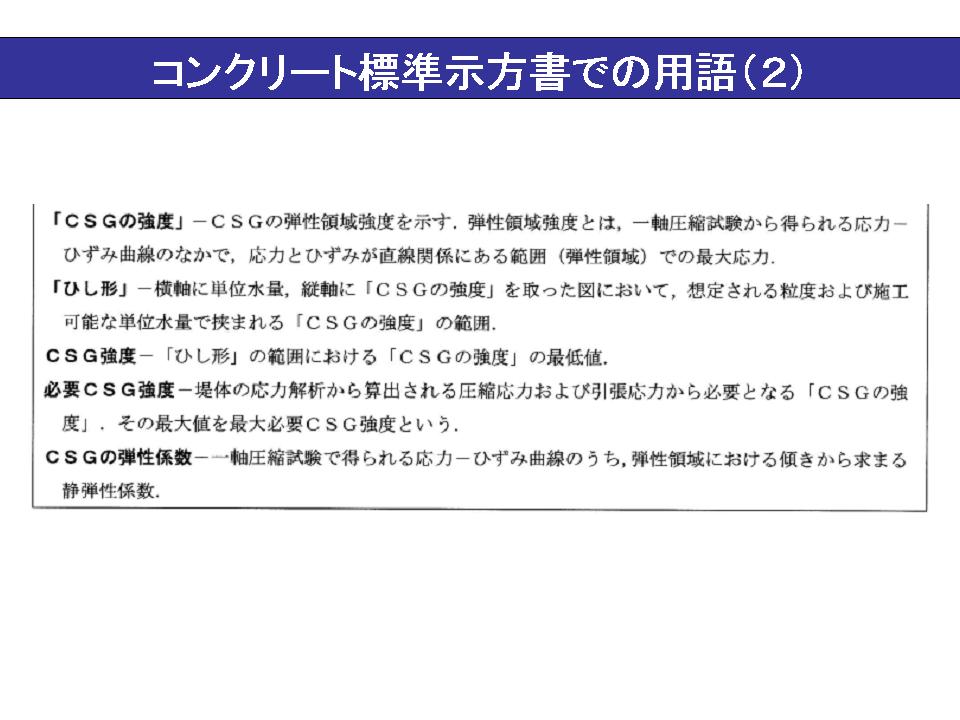 今の示方書の中では、例えば用語の中で、台形CSGダムというような表現だとかCSG材、CSGとは何か、こういうようなものを一応全部入れてございます。それから、CSGの強度というようなものも挙がっております。(図-39参照)