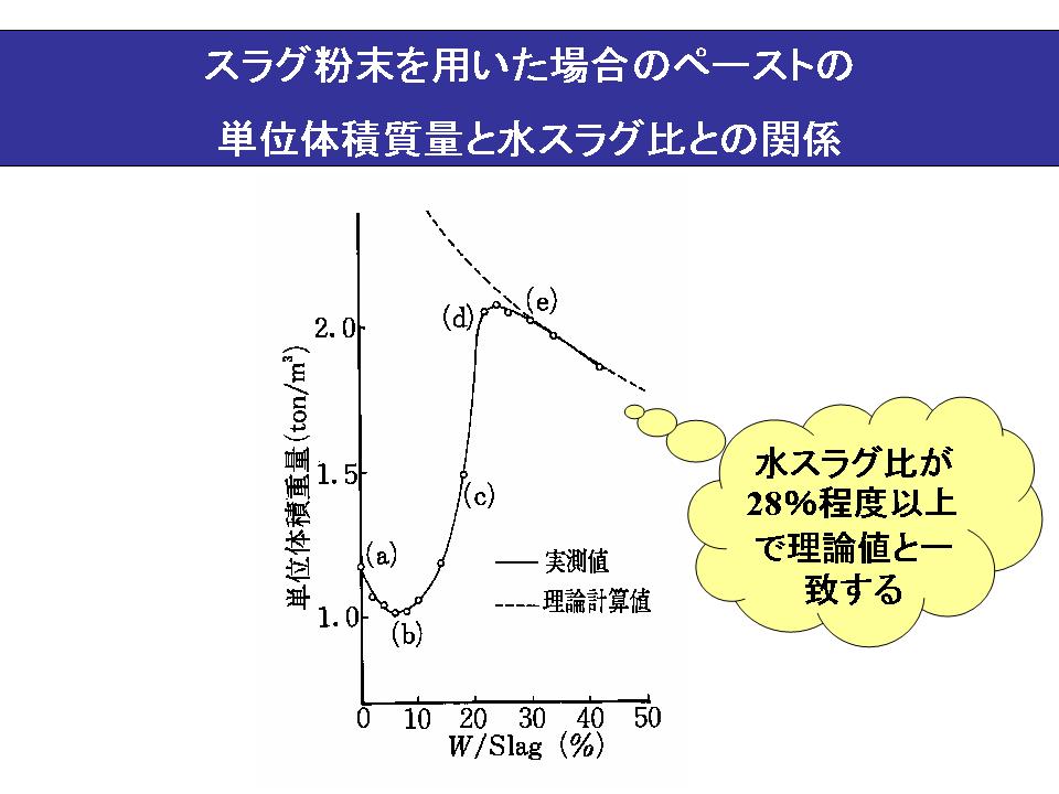 先ほどの図-44に示したように、CSG材が単位水量によってなぜ強度が上がって下がるようなことになるのかというと、これは、実はセメントとかスラグの粉末だけを使っても同じことが起こります。図-48は、横軸に水とスラグの比、縦軸に単位体積重量をとってあります。そうすると、スラグだけ、要するに水が全然入っていないというときは、かなり単位体積重量が小さい。それにだんだん水を入れていくと、曲線に示すようにこういうふうに上がっていきます。このように単位水量によって大きく単位体積重量が変わります。
