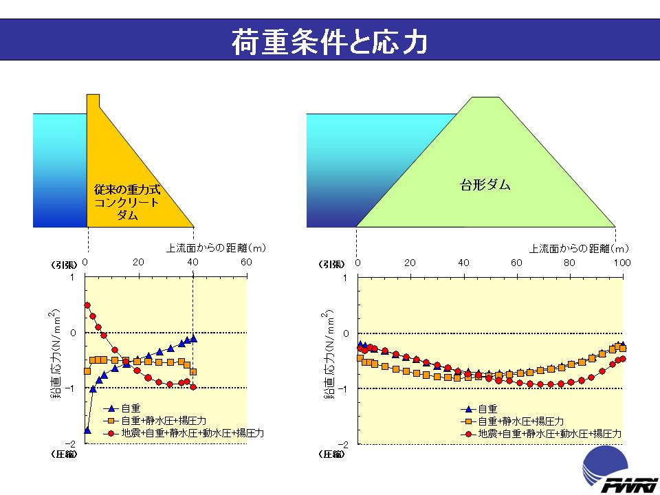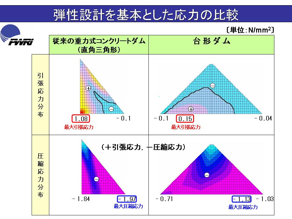実際に、設計応力の計算をしても、重力式のコンクリートダムですと、図-59にあるようにこの一番上流面に非常に大きな引張応力が発生しますけれども、台形ダムだとそれが起こらないというところがメリットとして挙げられます。