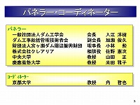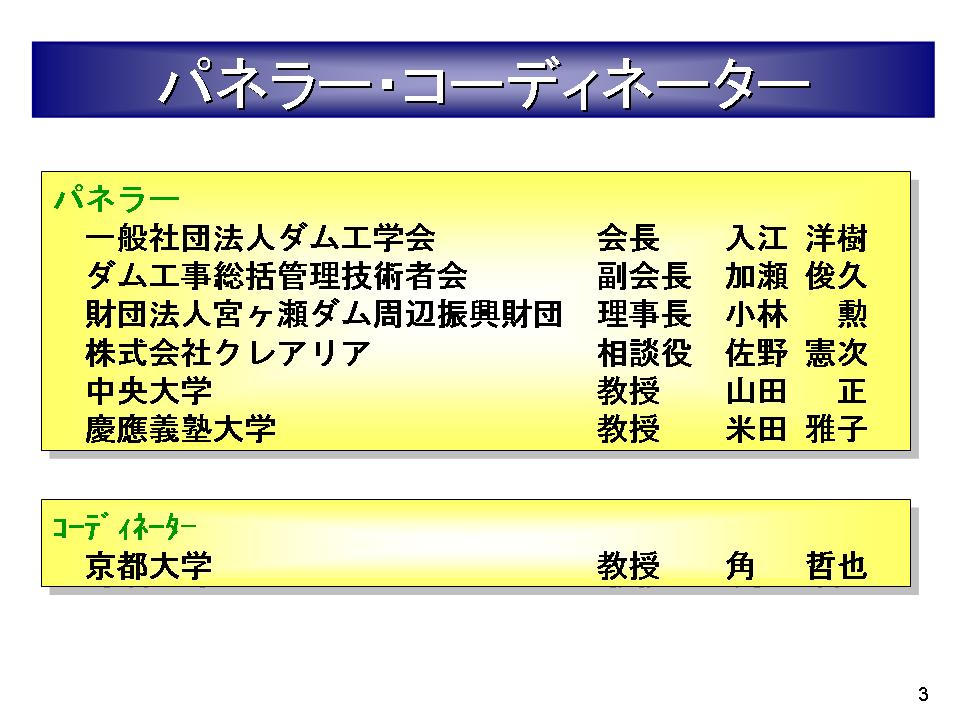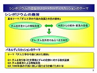 このシンポジウムでは、ダム技術者サイド、今日はちょうど6名の方にパネラーになって頂きましたけれども、いわゆる主体的に事業者サイドとして進めてこられた方からのご意見、また受け手側と言うのでしょうか、市民や社会がどのような形でそれを今まで感じ受け止めてきたか、あるいは今後どういう形で情報を流していくべきだろうかという、受信者側の立場、この両方の観点からディスカッションを進めたいと思います。その中から、このダム工学会あるいは皆さんダム技術者、それぞれの方々がそれぞれの分野でどのような、今後の進むべき方向を見つけていったらいいのかと、そういうきっかけになればいいと思います。テーマとしては、下に3つ書かせていただきましたけれども、現状の問題認識、それからダム技術者の情報発信、それから受信という形の相互交流を深めること、それからこういうことを踏まえて、今後1,000年後と書きましたけれども、これは入江会長から後ほど話題提供がありますけれど、今後に向けてということで、時間的な長いスパンで見た時のこのダム工学、あるいはこれを含めた国土というものをどのように残していくのかという点で提案をできるかというふうに思っております。