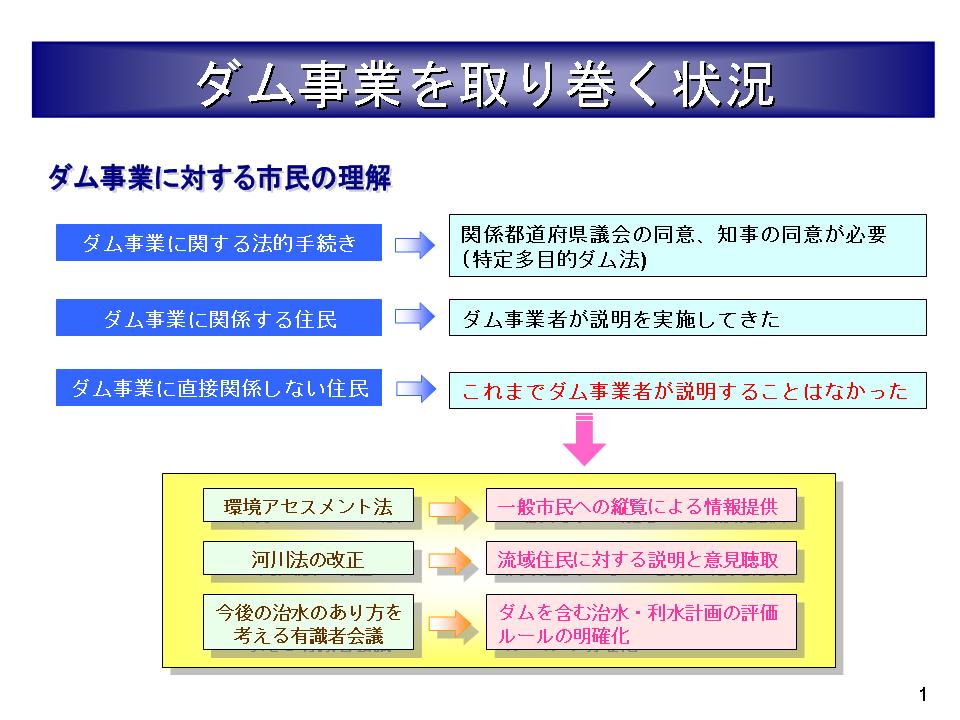 それで、従来環境問題、課題ということでアセス、それから河川法が改正されまして、流域委員会等で色々な計画論についての意見、情報提供、ディスカッションが進んでいるわけです。まさに今日出席していただいている山田教授もメンバーとして加わって頂いておりますが、今後の治水のあり方を考える有識者会議ということで、ダムが一つの社会的な課題・話題になっているというのも事実でございますので、このダム工学会として、どのような情報提供のあり方、それから今後に対する社会の提案をしていくのかということが問われているということではないかと思います。