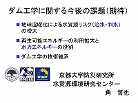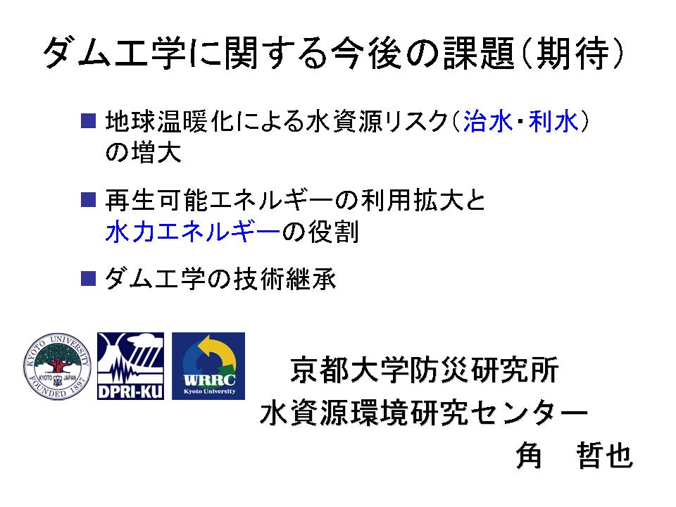 今日、色々出てきました「長期的視点」ということで考えたときに、温暖化の話に、ダムなりダム技術、ダム工学会はどう貢献できるんだろうかという話、この際、治水、利水、エネルギーの観点だと思います。それから、いわゆる技術継承の話も伺いました、ダム工学の技術継承をどうするか、この2点について少しお話させて頂きます。