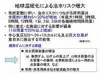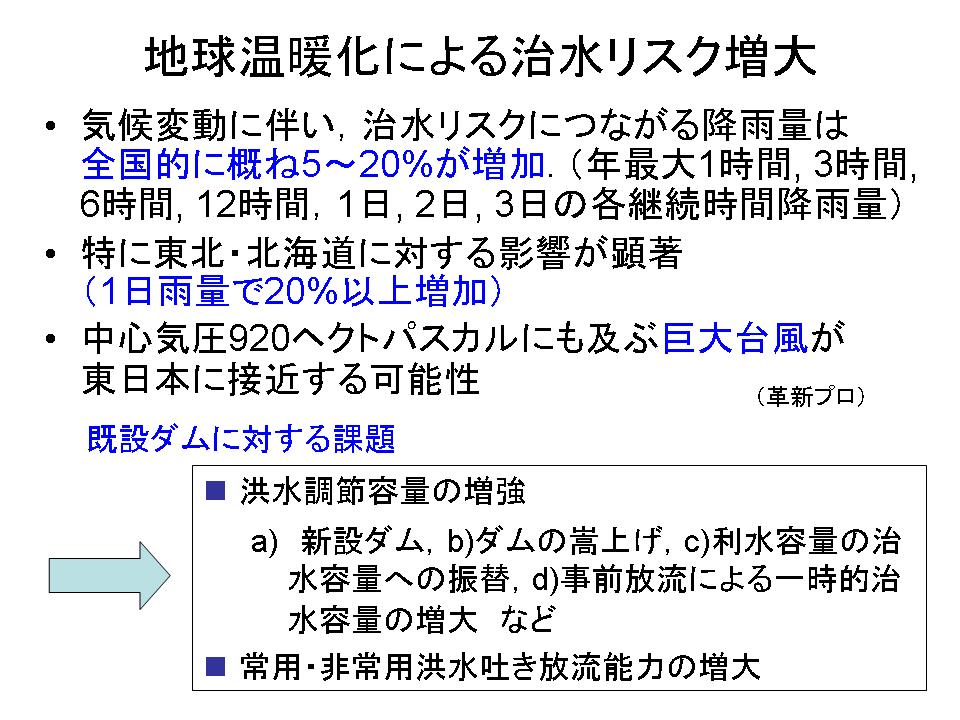 今、いろんな温暖化の影響評価というのは、かなり進んでおりまして、日本がリードしていると思って頂いて良いと思います。色んな研究グループがありまして、その中に革新プロジェクトというのがあります。その中でいわゆる長期のモデルを回して、今世紀末の例えば25年間で、どういう降雨が発生して河川の流量がどうなるのかという事を出しています。その中で治水に関して言いますと、全国的に5〜20%ぐらい流量が増えるんではないかと予測されています。それから特に東日本、東北、北海道で、その顕著な傾向がある。それから3点目は、台風がどうなるかということで、これは結構大きな課題だと思います。一般的には、台風の数は減るというふうに言われています。ただし、巨大な台風が来るということになります。いつ来るかもわかりません、どこに来るかわかりませんが、そういう見通しがシミュレーションの中から出てきてまして、その極端現象というのはなかなか精度的に難しい現状ではあるんですが、そういうメッセージが出つつある。この辺が非常に大事なところだと思います。こういう事を踏まえますと、今日は話がありました洪水調節としてのダムの機能、いろんなメニューがあると思いますけれども、こういうものをやはり技術者として提案していく。それから安全という観点では、既存の施設について、その巨大なものに対してどこまできちっと対処できるかという観点のチェックをしていくことが大事だと思います。次に、利水です。利水は、一般的に雪の問題が非常に懸念される材料です。いろんな代表的な水系で計算したものですけど、見て頂きたいのは、例えばこれは東北の最上川です。