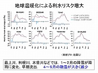 この年間のいわゆる月別の平均流量、これが現在気候で、この赤が将来気候ですけれども、他に比べると、大きく変わる可能性があるという結果が出てきています。これは何かと言いますと、1月・2月に雪ではなくて、雨になってすぐ出てくる。その代わりに4月・5月に融雪が無くなって普通の川になってしまうという事で、要するに融雪出水がおきる地域でなくなるわけです。今の水の使い方は、こういう融雪をベースにした水利システムが成立しているとすると、こういう所は根本的に水の使い方を変えないといけない。変えるか、あるいは、そういうものを調節する、そのadjustする機能がどこかに必要だということになります。これがダムとしての今後の役割であり、ダムの使い方のルールの変更が必要な部分もあるかもしれませんが、そういう事が一つ出てきている。
