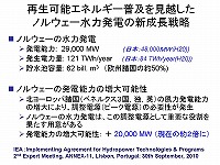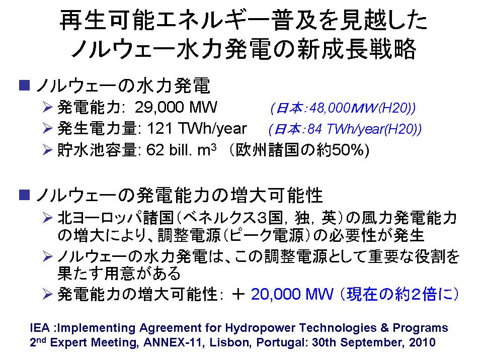 これが最後です。ノルウェーの事例ですけども、ノルウェーはヨーロッパの中で実は水力大国なんですね。それで日本と同じくらいの出力を持っているんですが、注目したいのがこの後半です。ドイツなんかもそうなんですけども、いわゆる北ヨーロッパは現在風力を積極的に開発しようとしている。ただし非常に不安定な発電量なものですから、安定化させるために実は水力とペアで世の中に供給しないと、その不安定な発電源ばっかりやっても、社会的なシステムとして成立しない。いわゆるバックアップと言うんですか、その安定化させる仕組みは、実は水力であるということなんです。ノルウェーは自国の発電量を倍増させるくらい考えている。これは目標だと思いますけれども、これをやってドイツとかイギリスとかベネルクス三国が、「風力をやるんであれば、ノルウェーは水力をやる事で、セットでヨーロッパの中の安定化のためにノルウェーは貢献するんだ」という風な事を言われています。日本も水力を今後どういう形で社会的にメッセージとして出していくかという時に、こういう視点、単に水力のエネルギーを生み出すというだけではなくて、そういう再生可能エネルギーによる発電のミックスの中で水力がどのような役割を果たして行くのかという点を、もっと打ち出していく必要があるのではないかという、一つの良い事例だと思います。こういう点も是非いろんな所で情報発信していければと思って紹介させて頂きました。