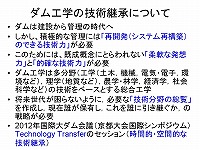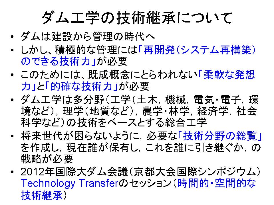 最後にもう一つ、実は2012年に国際大ダム会議が京都であります。その中で開催される国際シンポジウムというのを、私がお世話させて頂いていますが、その中に、テクノロジートランスファー、技術継承ということをダムの分野で、どんなふうに進めたら良いかという事をテーマとして挙げさせて頂いています。どんな話題になるかわかりませんけれども、ぜひ時間的に世代を超えて技術を継承していくことが必要であると考えてテーマ設定をしています。それから技術協力です。これは、国内だけではなくて途上国の話もありましたけども、日本が途上国を含めて、世界にどのような形で技術継承しながら技術協力していくか、こんな観点で情報発信が出来ればと思っていますので、ぜひ今日会場にお越しの方・パネラーの方を含めて、良い話題提供を日本から出来るような形でご検討頂ければ思います。