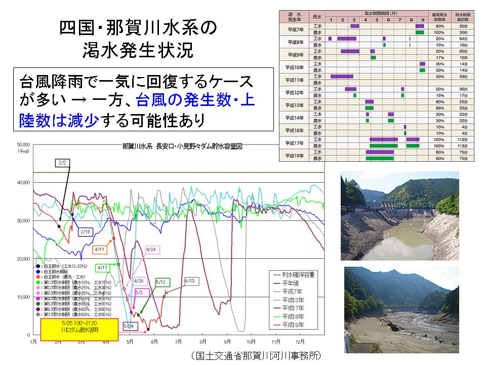 それからもう一つの台風に関しては、これは四国の那珂川の長安口ダムの貯水池の運用ですけれども、西の方はある意味、台風による雨の水に依存している部分があるわけです。治水と利水、両方とも諸刃の剣なんですけれども、台風が一つ来て貯水池が満杯になる。何年か前に早明浦ダムが全く空の状態から台風一発で貯まったという例がありましたけれども、台風が今後どうなるかが、実は非常に大事なポイントになってくると思います。