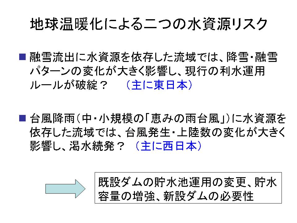 そういう意味で台風の発生数が減ると、かなり洪水が減るんではないかと言われてきています。特に、「恵みの雨 台風」と書きましたけれども、要するに災害にならないけども、ダムに水をもたらしてくれるような台風というんですか、気象現象が今後どうなっていくのかということをふまえて、ダムの貯水池は容量を持っていても空のままではしょうがない訳ですので、それをどんな風に予測して、管理していくのか。こういう辺りが非常に大事なポイントではないかと思っています。