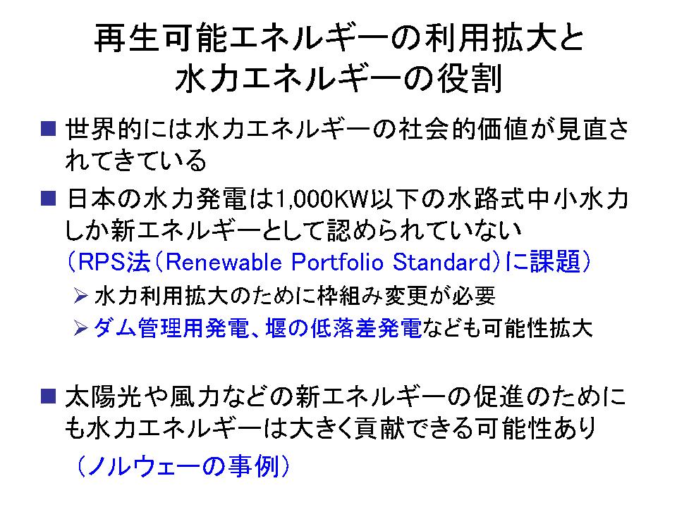 最後、エネルギーです。エネルギーは、米田先生からも話がありましたけれども、「水力エネルギーの社会的価値が世界的に見直されてきている」と書きましたけども、日本では余り高まっていないと言いますか、余り話題にならないのが非常に残念です。ヨーロッパとかアメリカなんかは非常にやってます。非常に盛んです。それは、新エネルギーとか再生エネルギーとか言葉の問題ももちろんあると思うんですが、RPS法なんかにも課題があるとのお話を伺っていますし、それからダムについては、やはり未利用エネルギーがたくさんある。これにもっと投資をして、エネルギーとして産み出していく事が必要だろうと思います。それから、もう一点最後はノルウェーの事例なんですけれども、新エネルギー、再生可能エネルギーを安定的に社会に供給するためには、実は水力の役割が必要であるという話です。