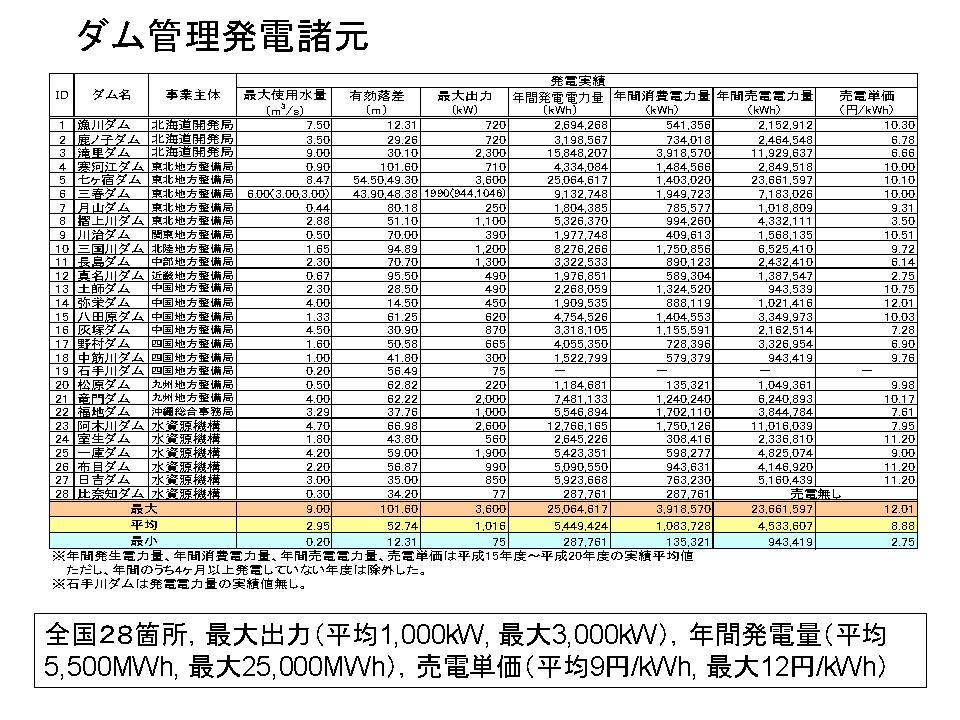 これは、ちょっと細かいですけれども、28ダムにおいてどれくらいの出力があって、どれくらいの経済的な評価がされているかを示しています。それほど大きいものではないのですが、例えば太陽光とか風力とかに比べて、それなりの位置づけを持っているということです。ダムの管理用発電を促進するためには、経済的に回していかなければいけないという事で、当然自家消費する部分、それからいわゆる売電する部分、このあたりの再評価といいますか、促進するためのメカニズムが必要だという話です。