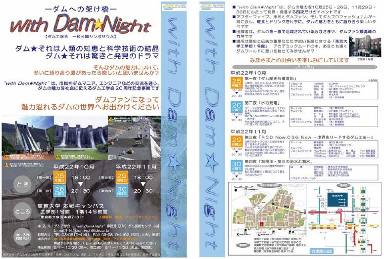 「with Dam Night(ウィズダム・ナイト)」は、ダム工学会20周年特別企画の一つとして企画され、その主旨は、市民・ダムファン、技術者・研究者の交流を通してダムに関する科学的基礎知識や情報を社会に適切に伝え、さらには多くの方々がダム見学に出かけるための「ダムへの架け橋」になることを目指すものである。そのタイトルは、ダムと共にある(with