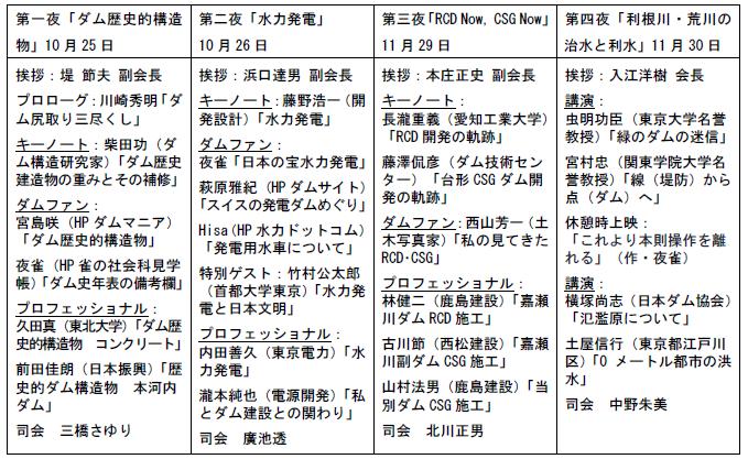 当企画の全体は、社会的意義の高い4テーマから成る四つの夜で構成され、各テーマは奥深く広範なダムの話題の中から、時節の話題に合ったものや市民レベルの関心の高さを考慮して選定された。各夜の展開は、起承転結を踏まえており、まず10月の第一夜はダムファン待望の「ダム歴史的構造物」の構造美で幕を明けて、第二夜でダムの重要な機能にしてクリーンエネルギーである「水力発電」を語り、11月の第三夜は趣を転じて世界をリードする最新技術である「RCD