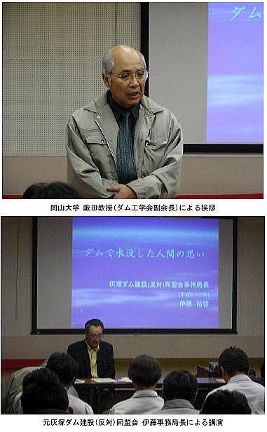 灰塚コミュニティセンターで開催した講演会では、灰塚ダム建設反対の時代からダム完成に至るまでの間、建設同盟会事務局長を務められた伊藤裕啓氏より「ダムで水没した人間の思い」と題して、ダム建設に対する地元住民の思い、事業後の地域活性化等についてご講演頂きました。また講演会後には、ダム建設事業に関する対話会を設け、地元住民の立場および産官学の立場からダム建設に対する思いについて熱心な議論を交わしました。