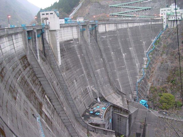 ダムの型式は、貯水池の水圧を堤体のアーチ作用により地山に伝達して支える「アーチ式コンクリートダム」の一種である「重力アーチダム」と呼ばれる型式に分類されます。同型式のダムは日本には12基しかない比較的珍しい型式のダムですが、二瀬ダムは重力アーチダムでは日本第3位の高さを誇ります。