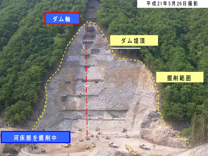 ダム本体工事は掘削工事が終盤となっており、今年9月に予定されているコンクリート打設開始に向けた準備が進められています。