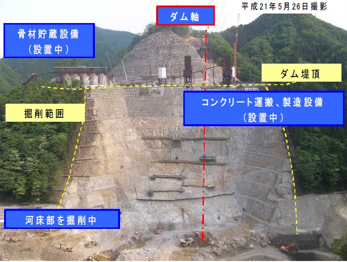 現在平成23年度のダム完成へ向け、ダム本体関連の工事と、付け替えとなる県道の工事が進められています。