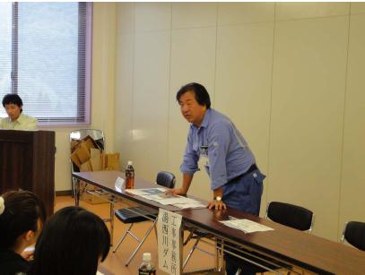 現地見学前には,湯西川ダム工事事務所の須田工事課長より湯西川ダムの事業概要や現在の工事進捗状況についてご説明頂きました。写真@A