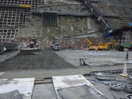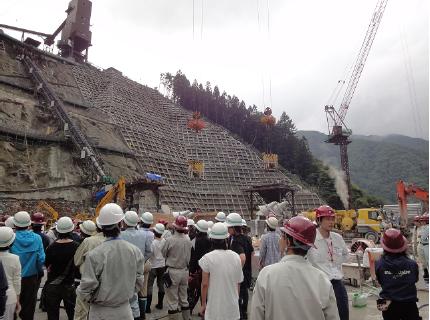 その後,現場に移動し,右岸天端,堤体下流,堤体打設面でダムの施工状況を見学しました。写真B〜I。右岸天端では,ダム展望所・コンクリート試験室・バッチャープラントを見学しましたが,工事を担当している鹿島・清水特定建設工事共同企業体の方々からの工事の効率性や品質管理についての説明を熱心に聞きながら,見学していました。堤体下流では,高さ119mのうち49mの高さまで工事が進んでいるダムを見学し,その後,堤体を背景に記念撮影を実施しました。堤体打設面では,RCD工法による打設で堤体が打ち上がっていく状況を間近で見学することができました。