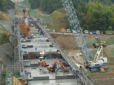 監査廊を埋め込みつつ打設。ボーリング試験も行われていた。 |