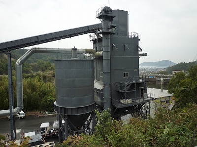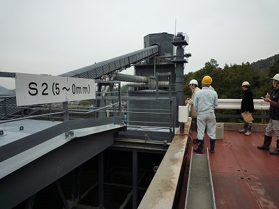 コンクリート製造設備は、自然の中にあっても目立たないように、との配慮で、濃いグレーに着色されているそうです。骨材プラントは、コンピューターで迅速、かつ正確に管理されているそうです。